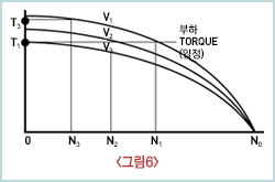 | ºÎÇÏ Torque°¡ ÀÏÁ¤ÇÒ ¶§ °ø±ÞÀü¾ÐÀÌ V1¡æV2·Î º¯ÈÇϸé ȸÀü¼ö´Â N1¡æN2·Î º¯ÈÇÑ´Ù. ¸¸¾à Àü¾ÐÀ» V1À¸·Î ÀÏÁ¤ÇÏ°Ô ÇÏ°í ºÎÇÏ Torque¸¦ T3·Î º¯È½ÃÄ×´Ù¸é ȸÀü¼ö´Â N1¡æN3·Î º¯ÈÇϴµ¥, ȸÀü¼ö º¯ÈÀ²¿¡ ´ëÇÑ Torque º¯ÈÀ²Àº ±ÇÃë¿ë¿¡ ºñÇØ ¸Å¿ì Àû´Ù. (±×¸²6) |